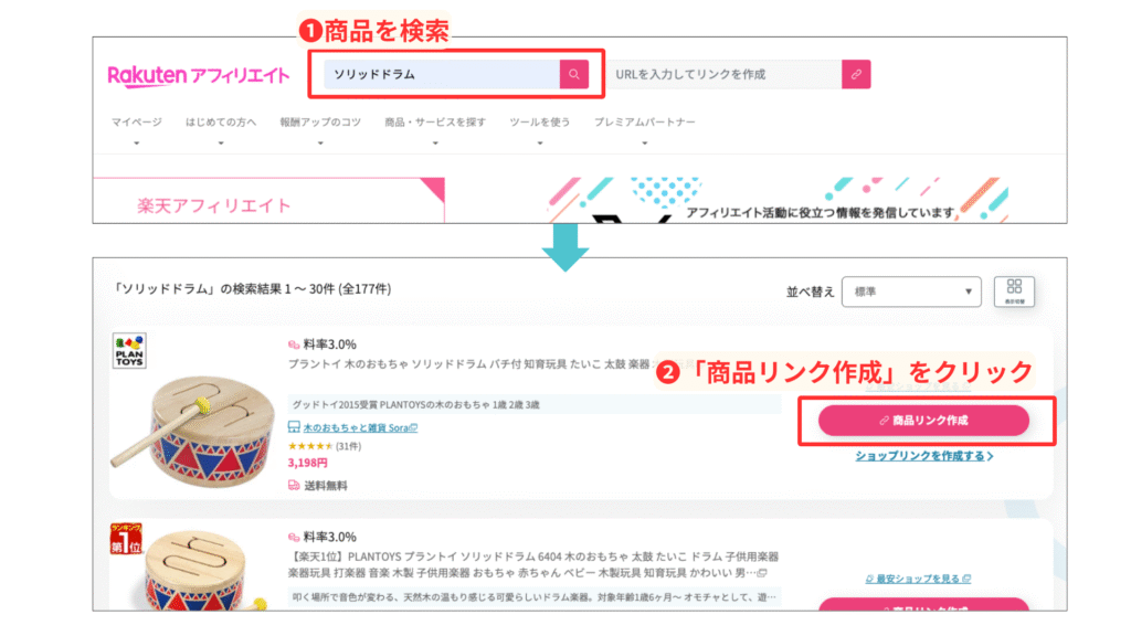 Googleなどで「楽天アフィリエイト」と検索して登録・ログインし、検索窓に紹介したい商品名(例:ソリッドドラム)を入力します