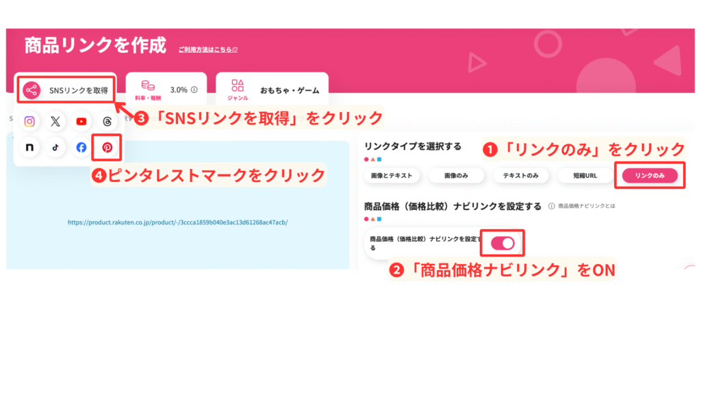 - 楽天アフィリエイトで「リンクのみ」「価格ナビON」のURLを取得