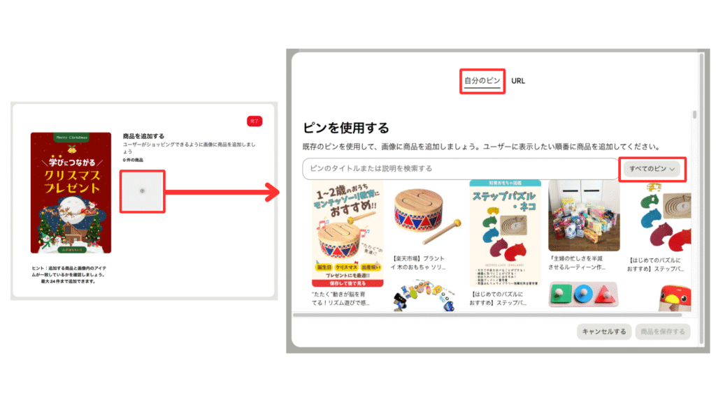 - リストにある場合: 紐づけたい商品(ピン)を選んで「商品を保存する」をクリック。