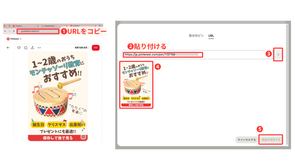 ここからが本題です。ただリンクを貼るだけでなく、Pinterestの「商品を追加する機能(カバンマーク)」を使うことで、さらに売上を伸ばすことができます。