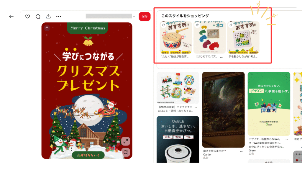 - 露出が増える: 他の人のピンよりも、自分が設定した「このスタイルをショッピング」欄が優先的に表示されるため、自分の他のピンも見てもらいやすくなります。